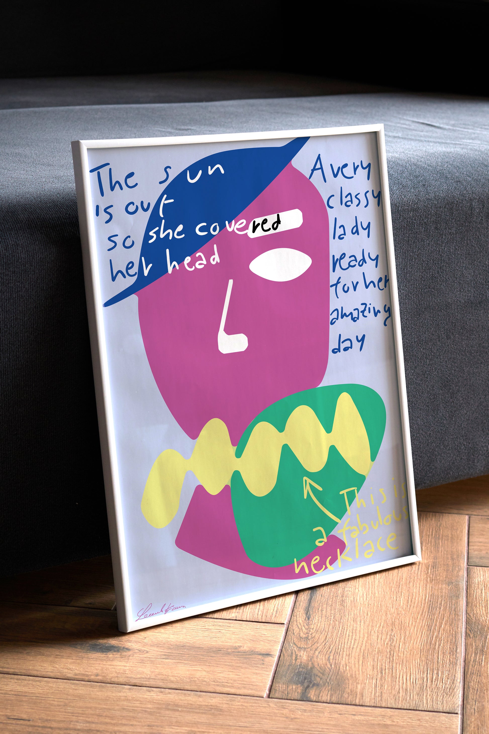 Una grafica dove si può apprezzare un volto di donna che sta indossando una grande collana d'oro. I testi descrivono quello che sta avvenendo.